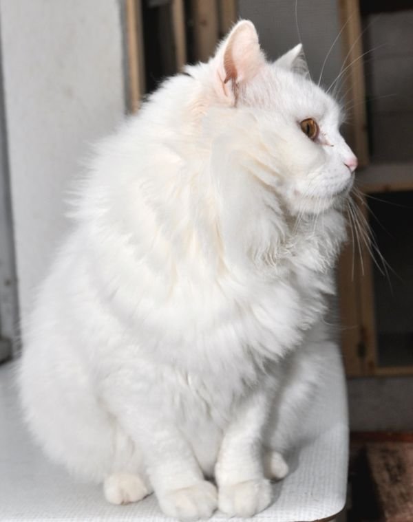 Al: Ist ein weißer wunderbarer Langhaar-Junge, den wir aus unserem Hauptgebiet holen mußten, weil er über den Schlafplatz herrschte und mit einigen unserer ruhigeren Einwohner kämpfte. Er wurde von einem unserer Freiwilligen gerettet, die einen Anruf von beunruhigten lokalen Einwohnern erhielten, die einen Mann sahen der ihn in einen Pappkasten zwingen und ihn in einem Abfall-Behälter .... so jämmerlich... bringen wollte. Al hat uns Menschen eine neue Chance gegeben und hat bewiesen, was für ein schönes Haustier er sein kann:-) Er ist eine "Leute " Katze, aber nicht "Katze " Katze, so ist ein Haus ohne andere Katzen ein Muß.