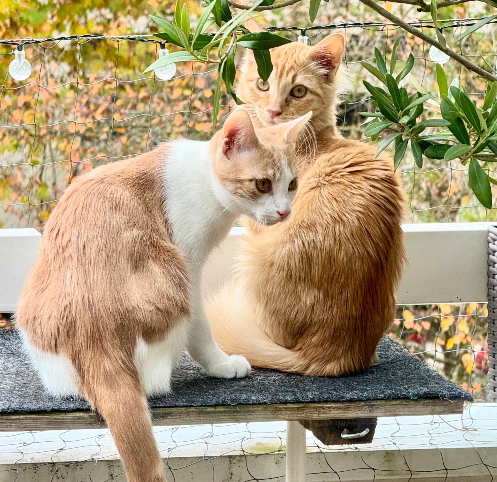 Da wir so zutraulich sind, möchte unsere Pflegemama nicht, dass wir in den Freigang kommen. Aber ein großer vernetzter Balkon oder noch besser ein vernetzter Garten wäre toll, da wir gerne draußen sind und jetzt im Herbst die Blätter jagen, das macht großen Spaß.