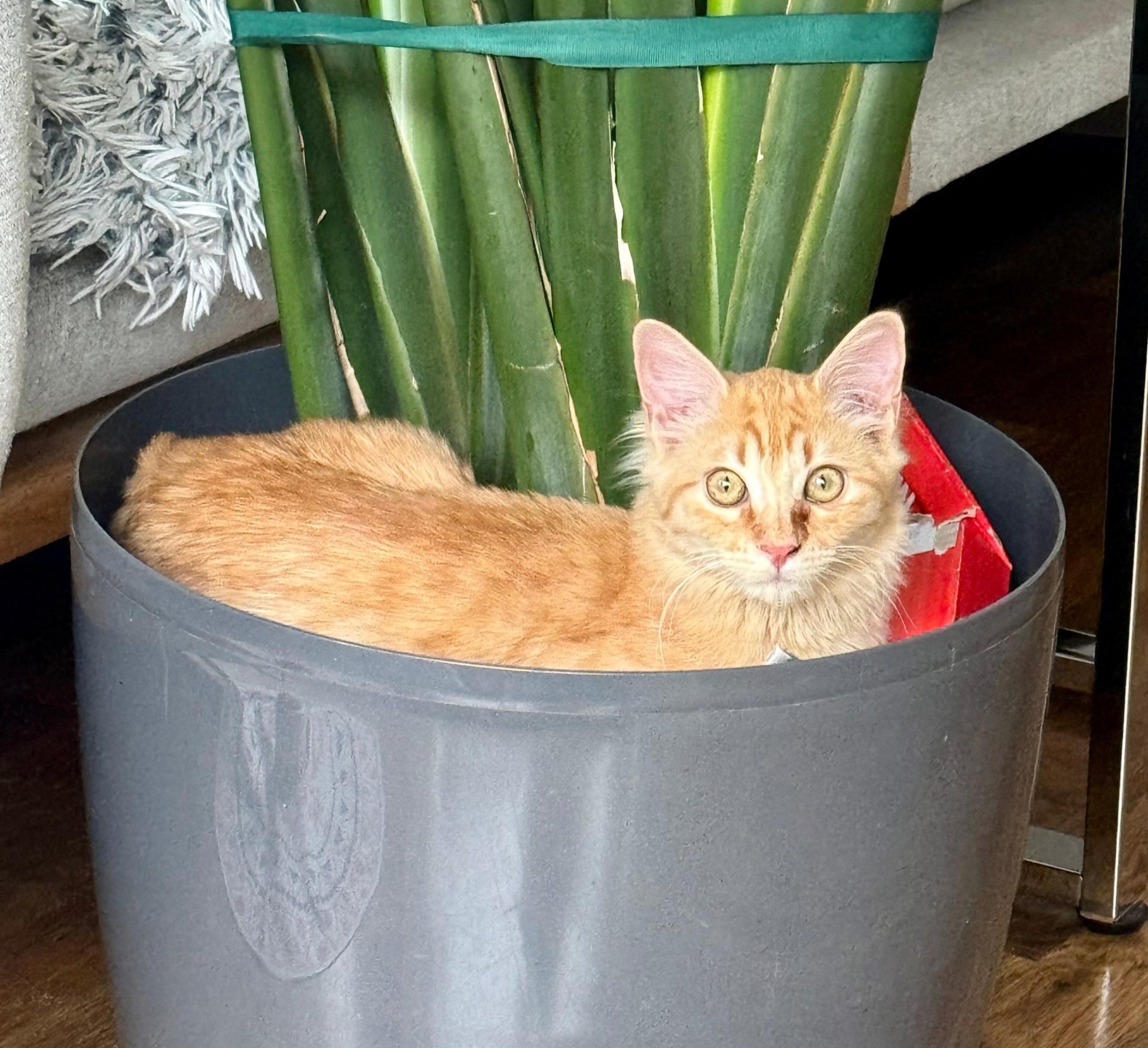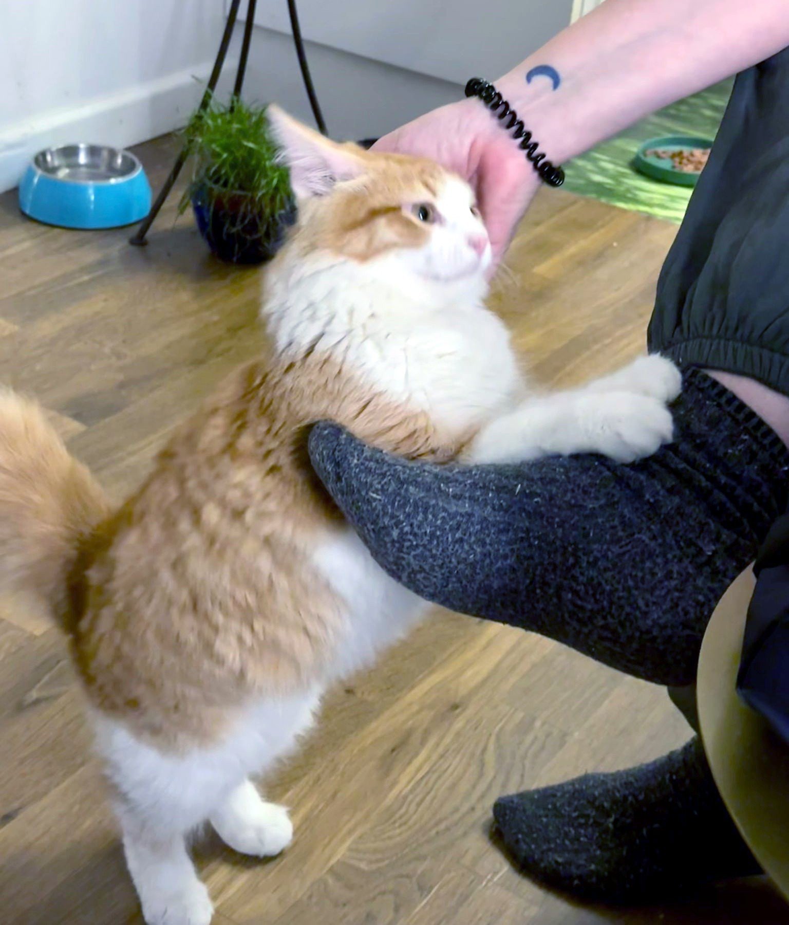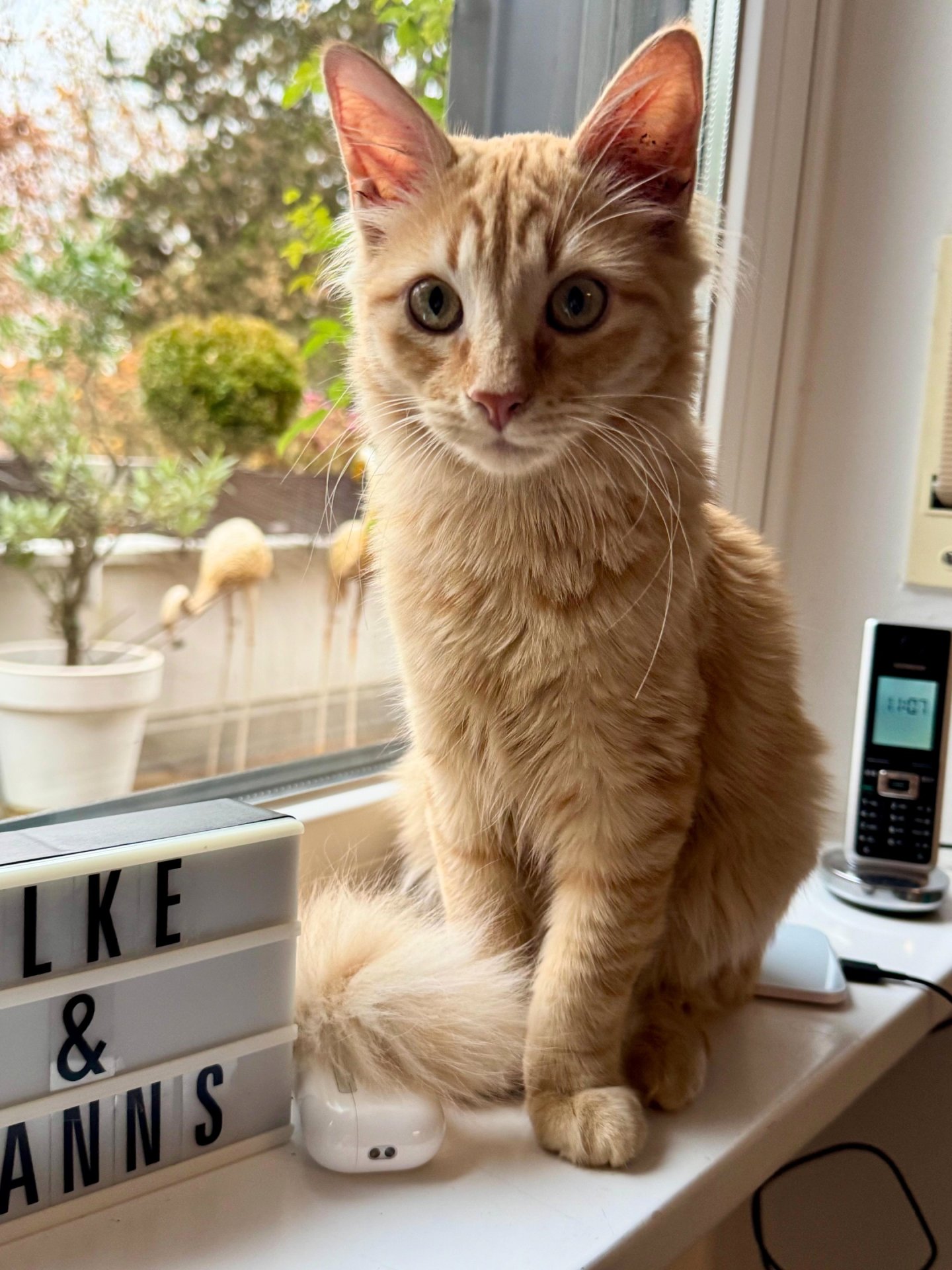 Ich, Clarence, bin super verschmust und verspielt. Ich liege sehr gerne im Arm und natürlich ist klar, dass ich auch mit im Bett schlafe. Die Menschen sind aber auch so schön warm und kuschelig. Besuch wird von mir freudig begrüßt, auch die Kollegen bei den Teams-Meetings stupse ich gleich mal an. Dort bin ich schon der absolute Star, ich bin immer dabei und mittendrin. Wenn ich nicht gerade schmuse, mache ich gerne mit meinen Freunden Goldi und Teddy Unfug. Alles wird genau untersucht, vor allem Wasser finde ich großartig. Da kann ich lange zuschauen und dann mit meinen Pfoten darin rumplanschen. Großartiges Spiel! Meine Pflegemama sagt ich bin äußerst klug. Ich habe sofort die Katzenklappe auf die vernetzte Dachterrasse verstanden, hehe.