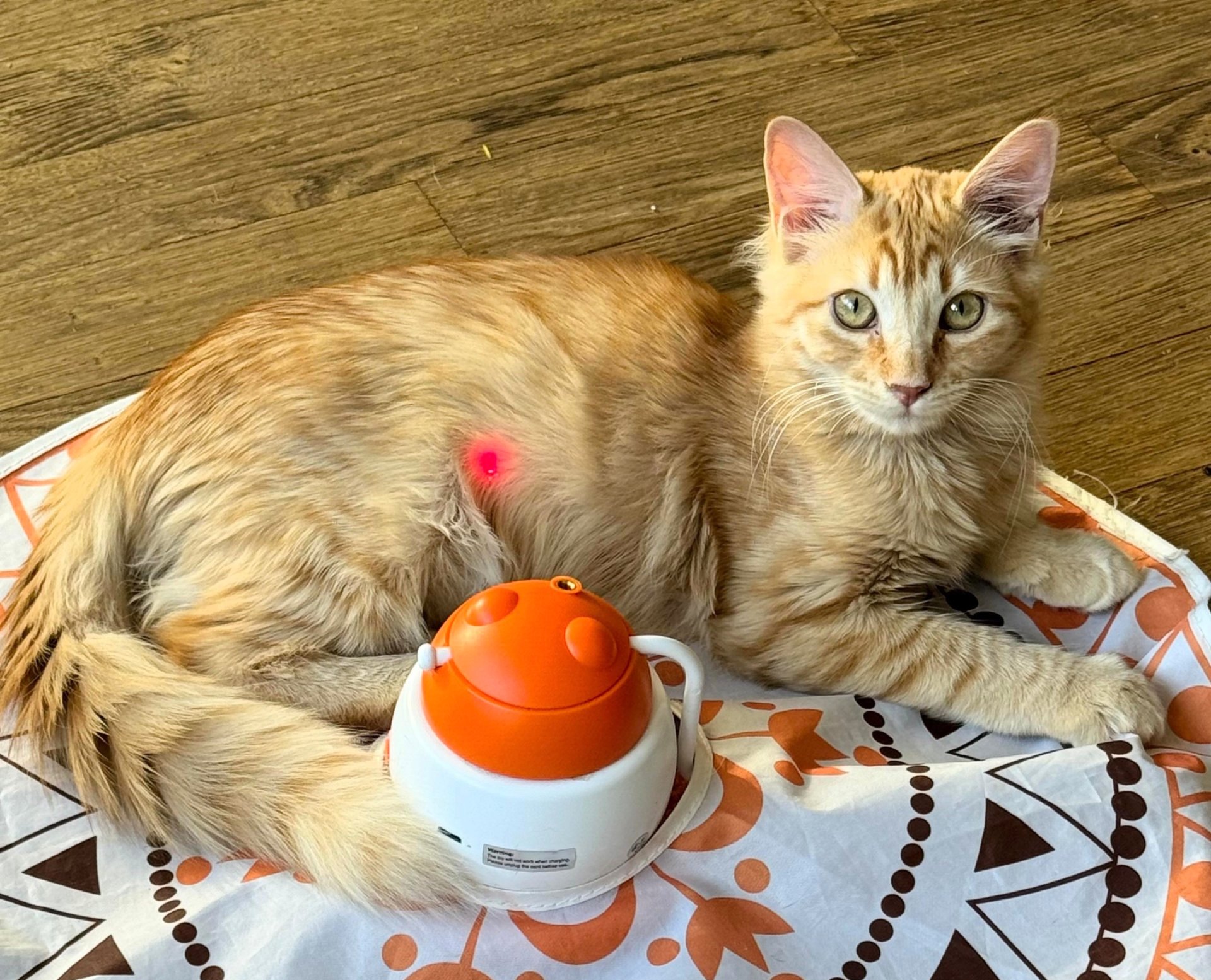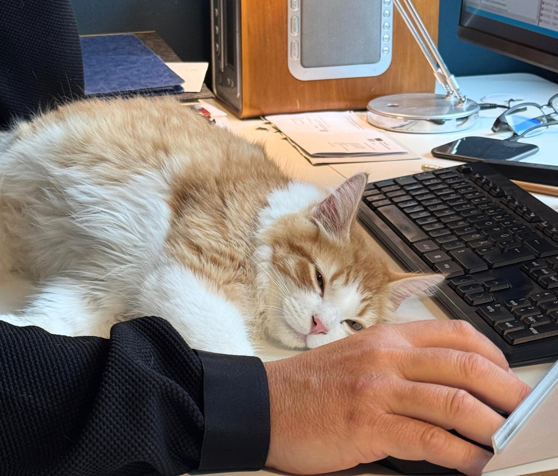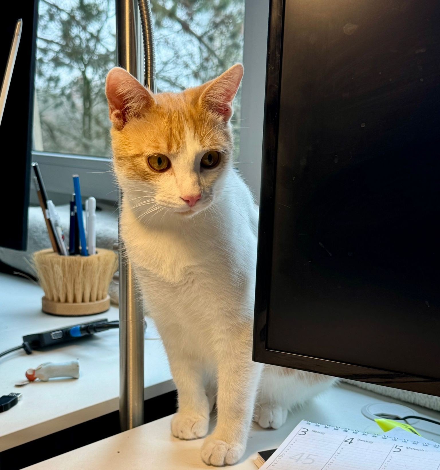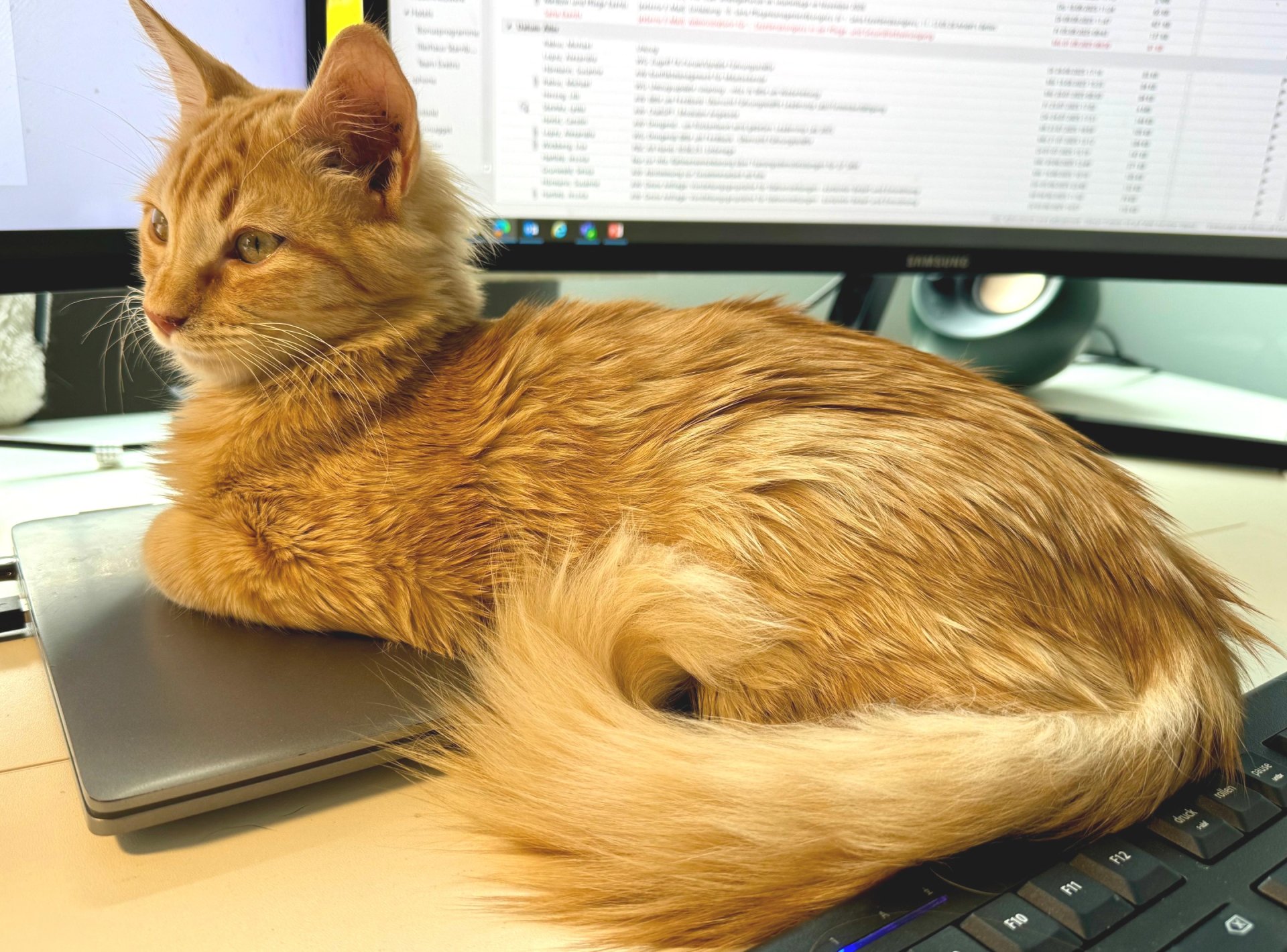 Ich, Clarence, bin super verschmust und verspielt. Ich liege sehr gerne im Arm und natürlich ist klar, dass ich auch mit im Bett schlafe. Die Menschen sind aber auch so schön warm und kuschelig. Besuch wird von mir freudig begrüßt, auch die Kollegen bei den Teams-Meetings stupse ich gleich mal an. Dort bin ich schon der absolute Star, ich bin immer dabei und mittendrin. Wenn ich nicht gerade schmuse, mache ich gerne mit meinen Freunden Goldi und Teddy Unfug. Alles wird genau untersucht, vor allem Wasser finde ich großartig. Da kann ich lange zuschauen und dann mit meinen Pfoten darin rumplanschen. Großartiges Spiel! Meine Pflegemama sagt ich bin äußerst klug. Ich habe sofort die Katzenklappe auf die vernetzte Dachterrasse verstanden, hehe.