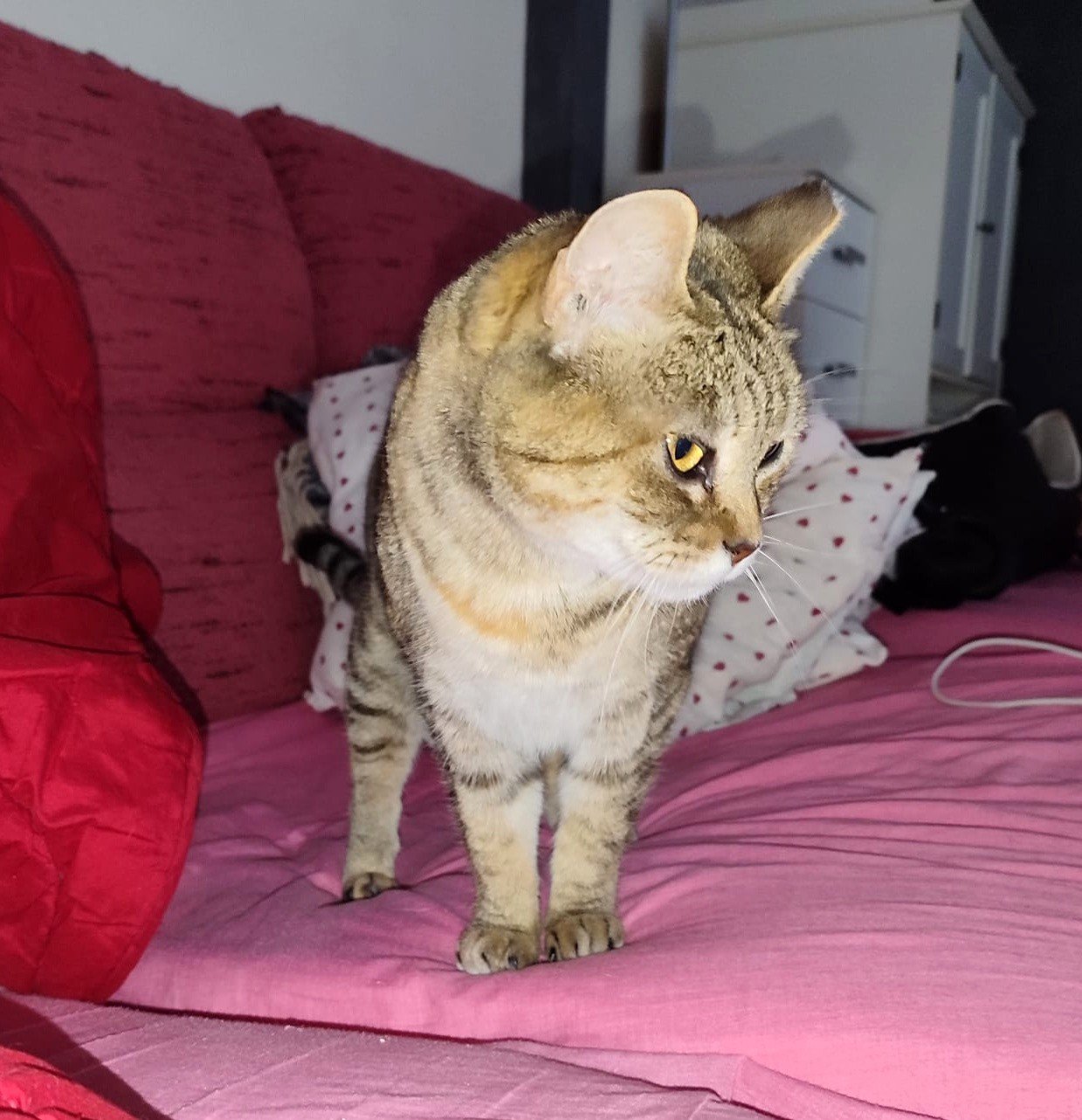 Gesundheitlich geht es mir gut. Ich hatte einmal den Calicivirus, meine hinteren Zähne wurden entfernt und ich bekam Interferon – heute bin ich fit und munter. Eine Wohnung reicht mir vollkommen, ein sicherer Balkon wäre ein schönes Extra, ist aber kein Muss. Hauptsache ich finde ein Zuhause, in dem ich endlich ankommen darf. Vielleicht bei dir?