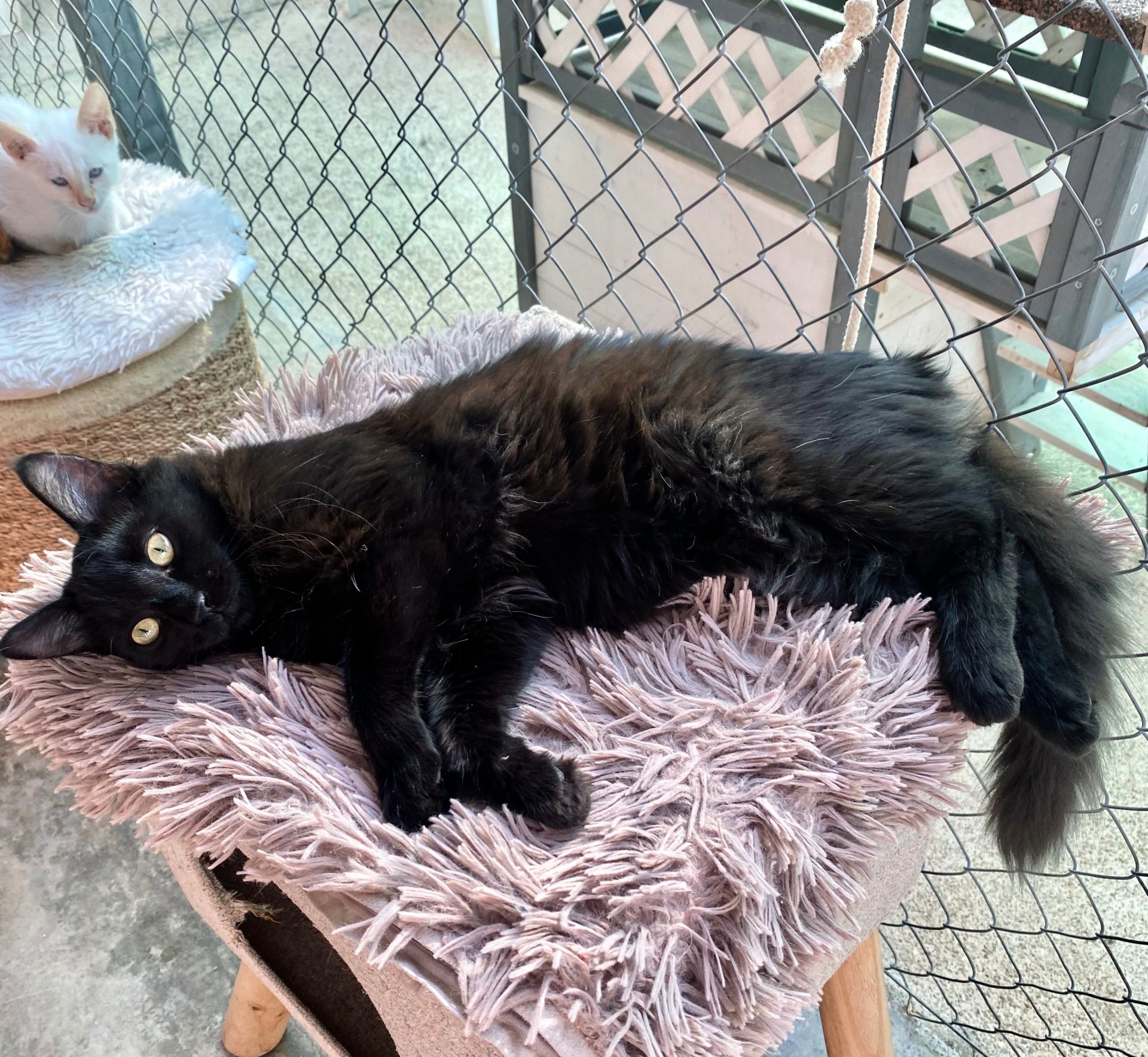Tara teilt sich ihr Gehege mit 8 anderen Katzen unterschiedlichen Alters, unterschiedlicher Größe und unterschiedlichen Temperaments und versteht sich mit allen gut. Mit den kleineren Kätzchen kuschelt sie oft, damit sie sich warm und sicher fühlen.