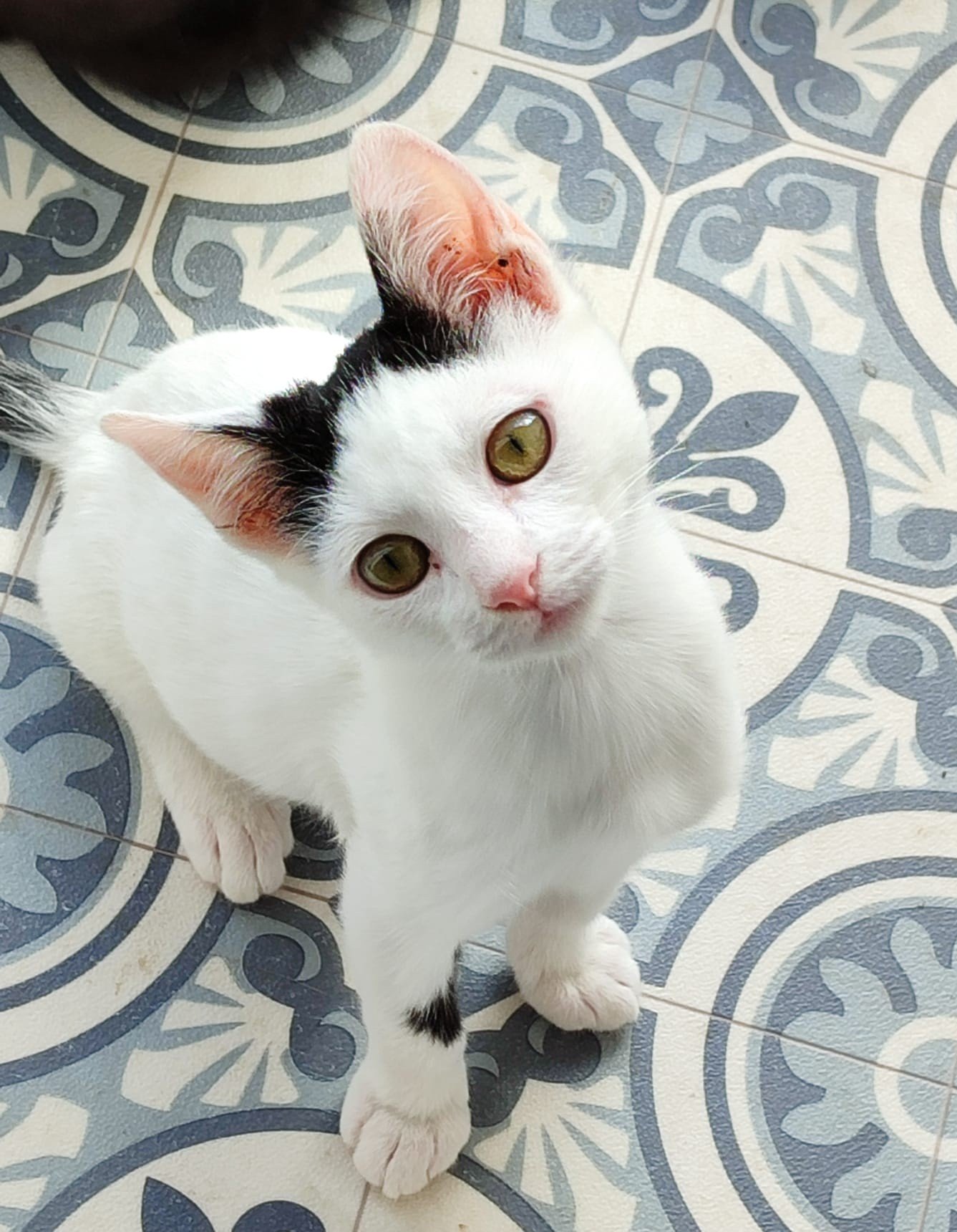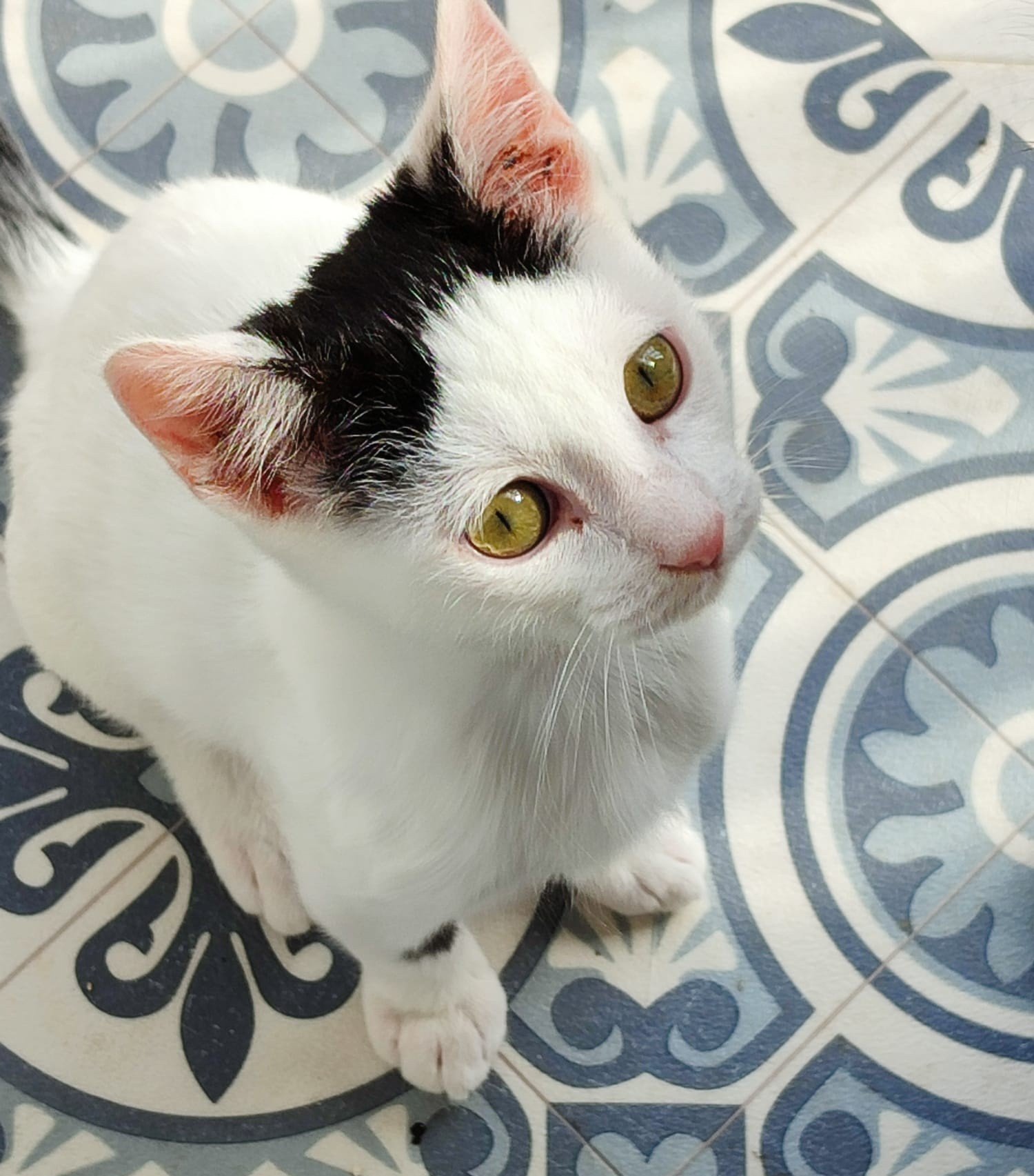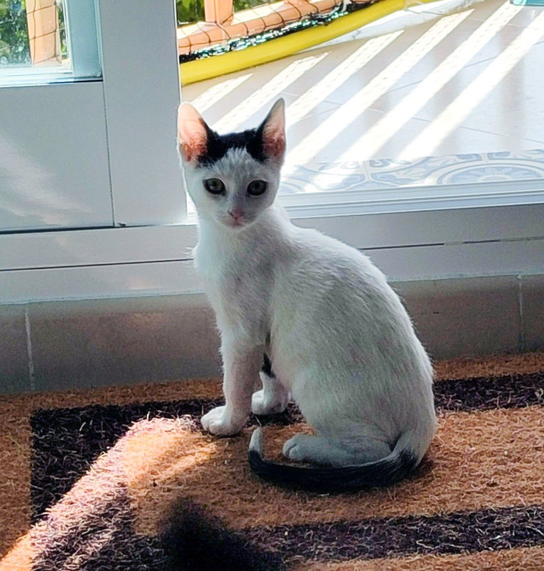 Wer da so niedlich guckt? Ich, Lisboa! Ich bin ein junger Kater mit weißem Fell und einer niedlichen schwarzen Färbung auf dem Kopf, wie ein kleiner Hut, den ich zum Gruß aber nicht abnehmen kann. Trotzdem: Sei gegrüßt und lass mich dir meine Wenigkeit vorstellen!