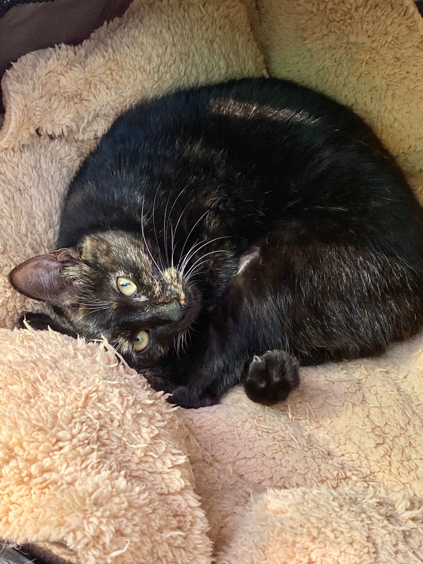 Diese wunderschöne Schildpatt-Katze heißt Aster. Sie kam mit ihrer Mutter Daisy und ihren 3 Schwestern im Alter von etwa 10 Wochen ins Tierheim. Leider waren die Kleinen nicht sozialisiert und hatten große Angst vor Menschen. Das wurde noch verschlimmert, als sie kurz nach ihrer Ankunft an Ringelflechte erkrankten und wir den Kontakt auf ein Minimum beschränken mussten. Nach einigen Wochen Behandlung erholten sie sich alle gut und wir konnten mit der Sozialisierung beginnen.