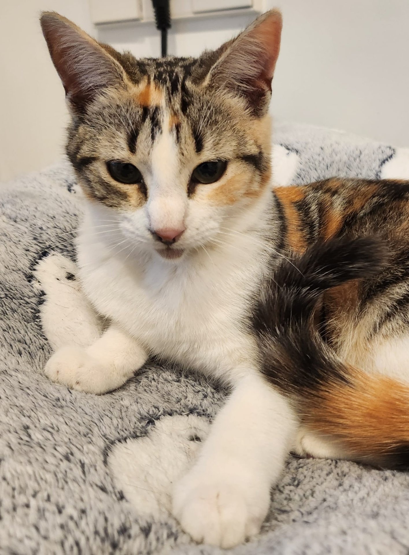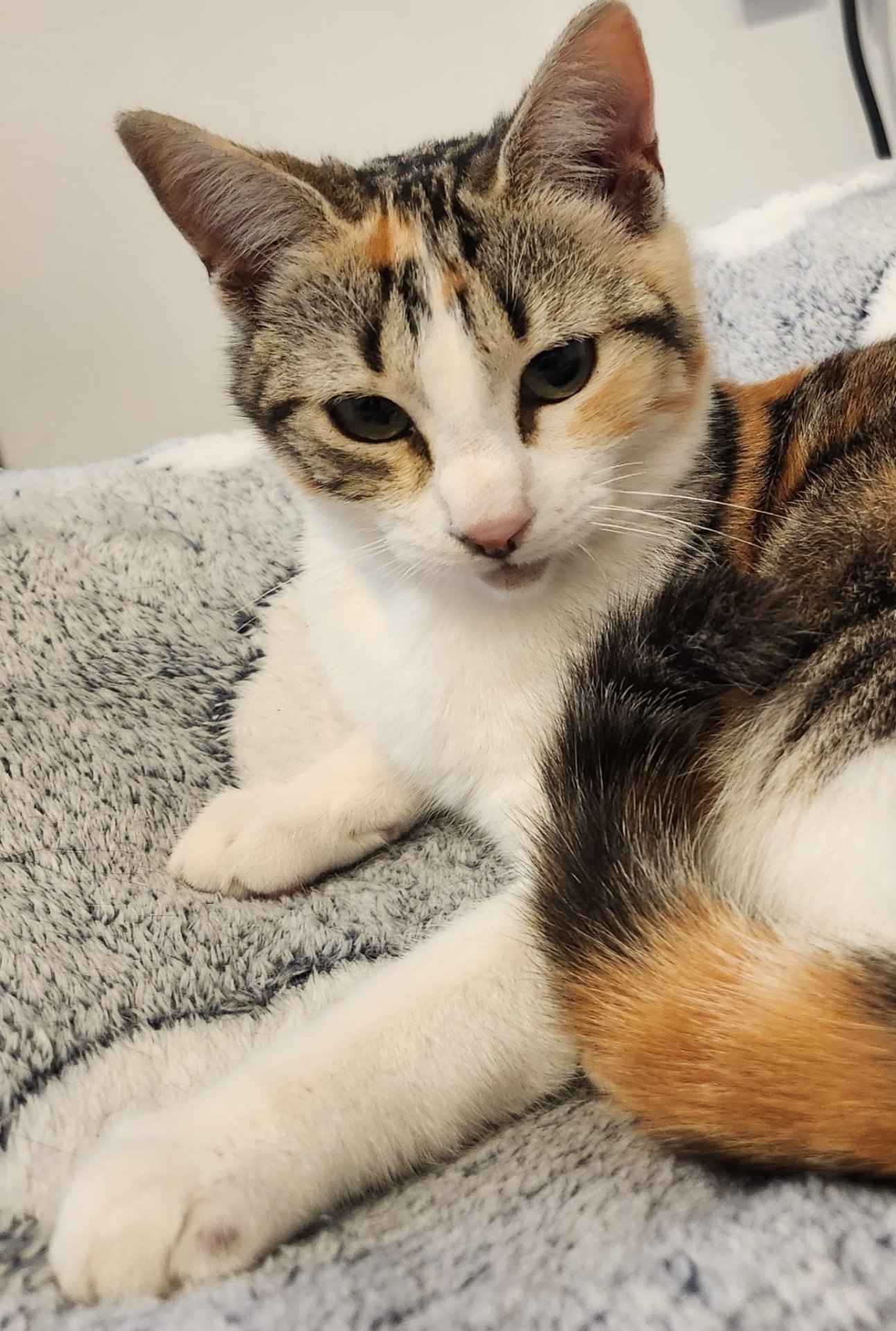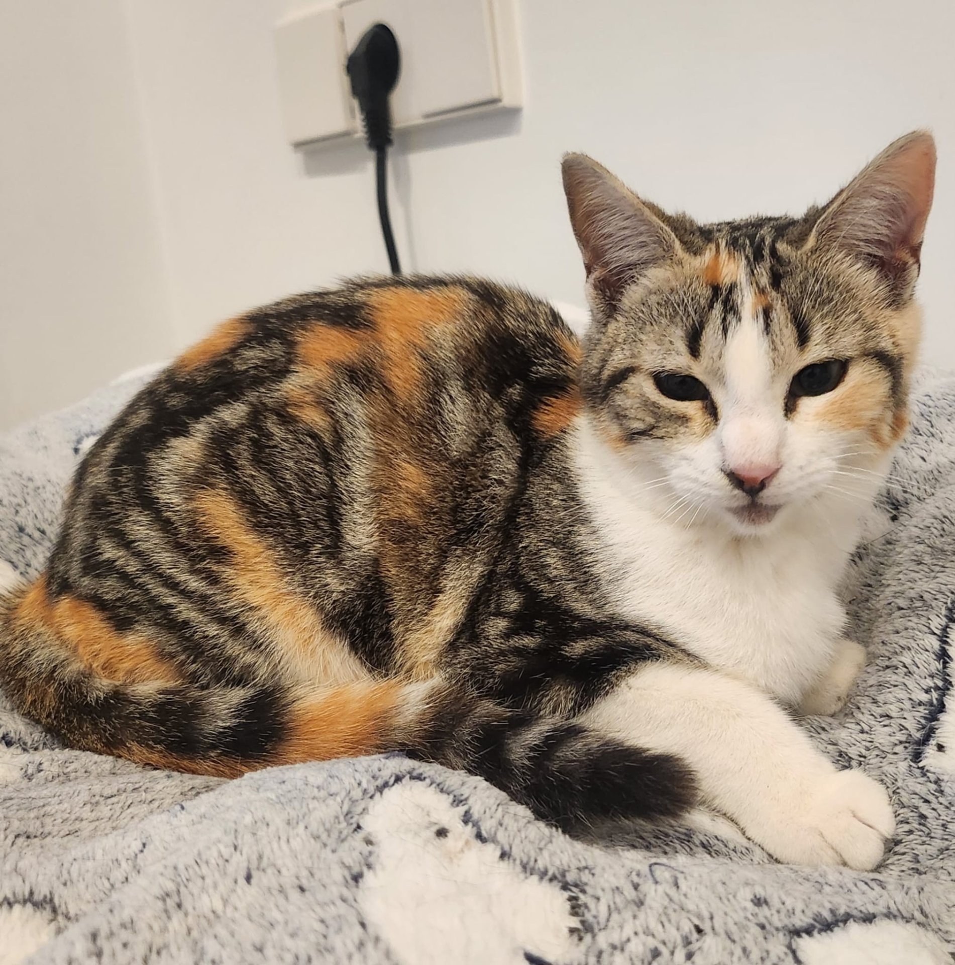 Schau mir in mein hübsches Gesicht! Das bin ich: Lulú – eine dreifarbige, junge Katze.