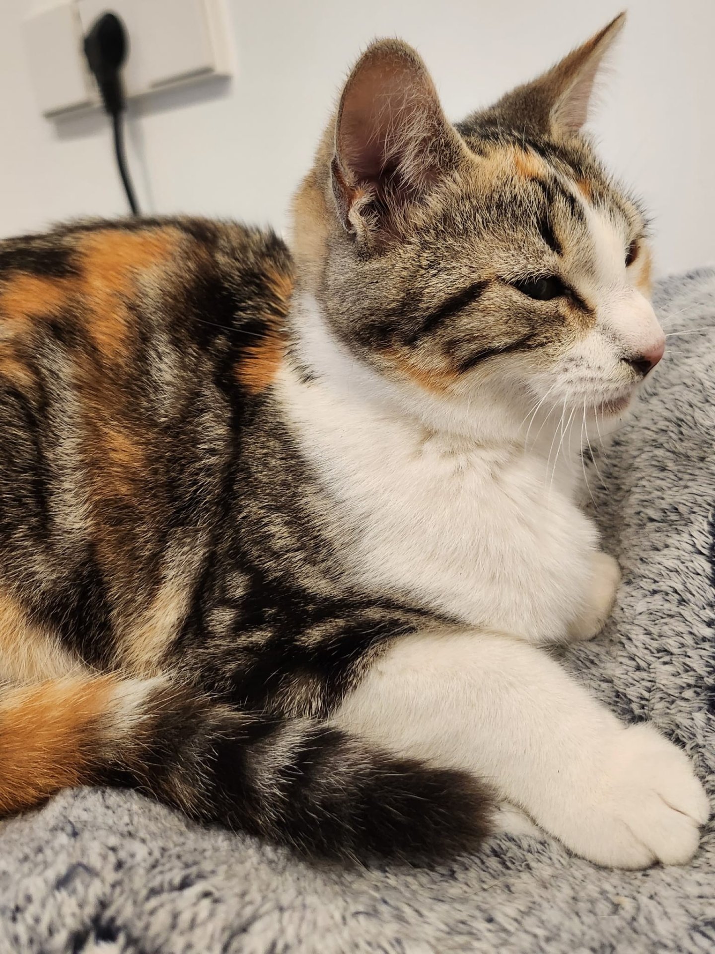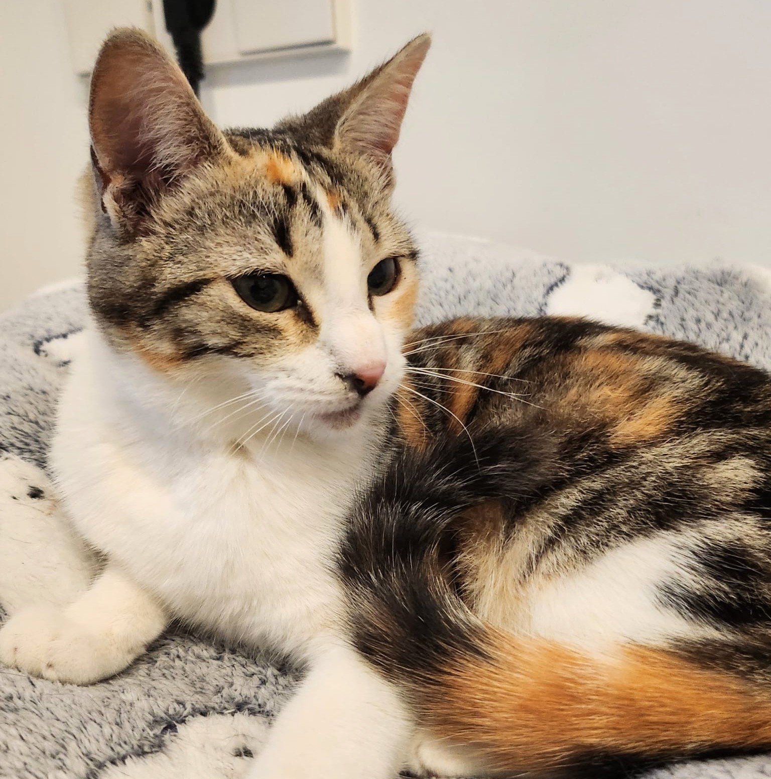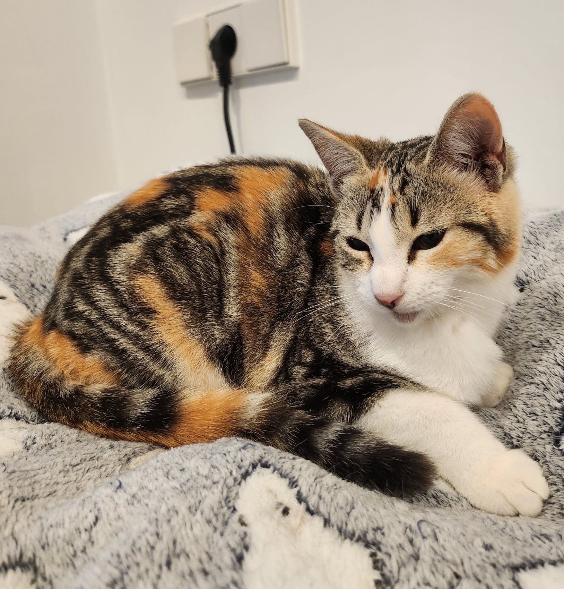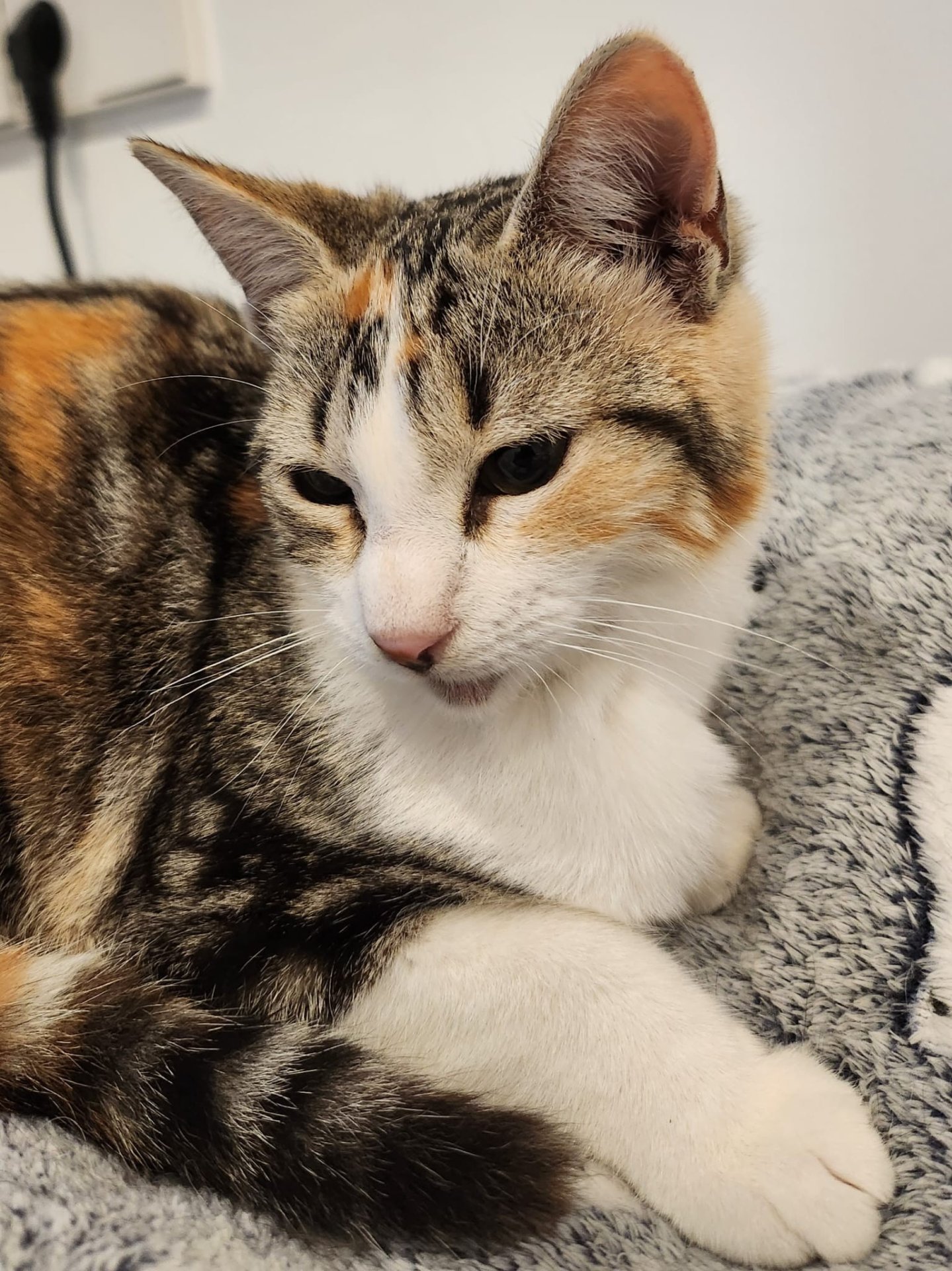 Schau mir in mein hübsches Gesicht! Das bin ich: Lulú – eine dreifarbige, junge Katze.