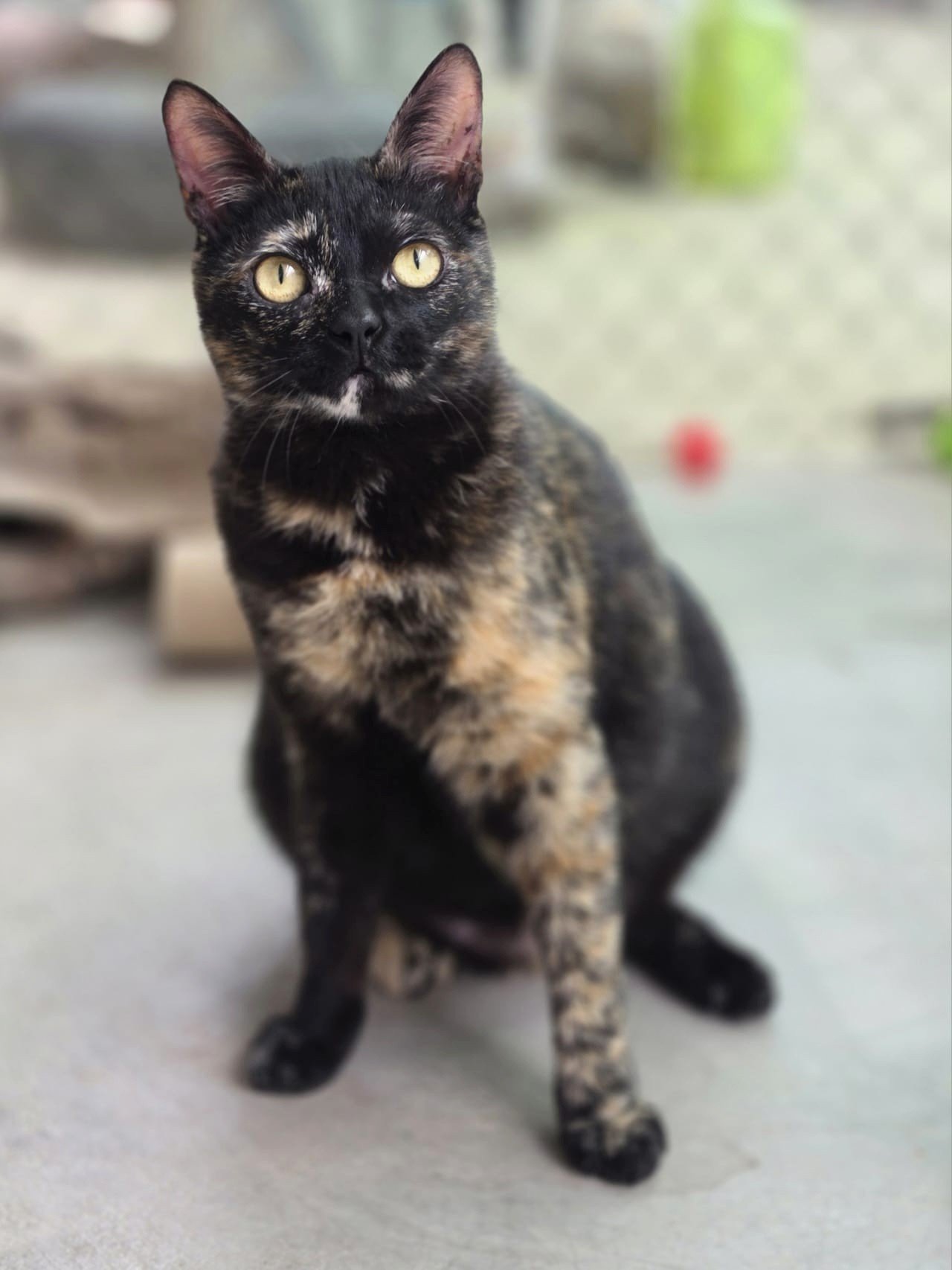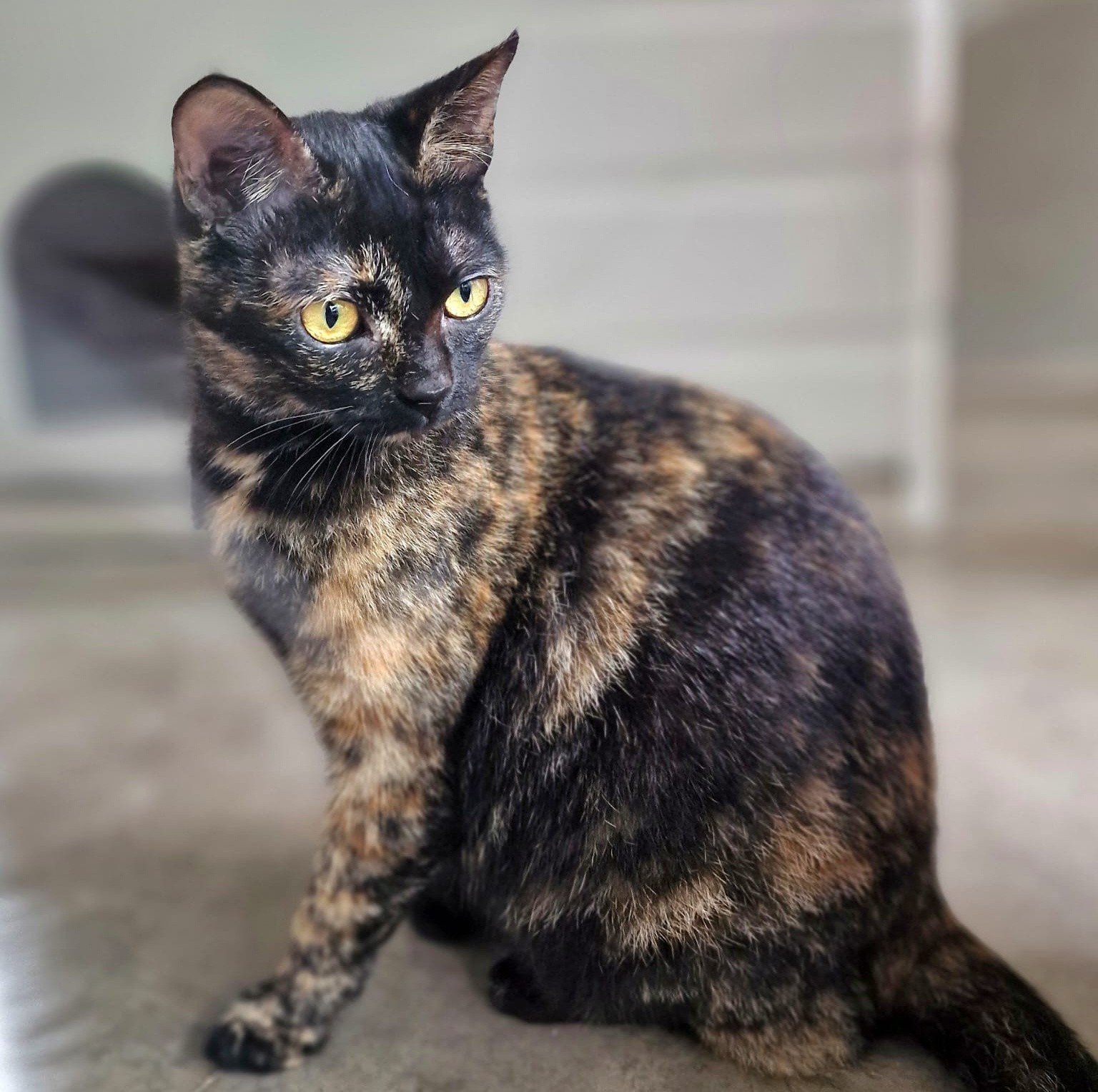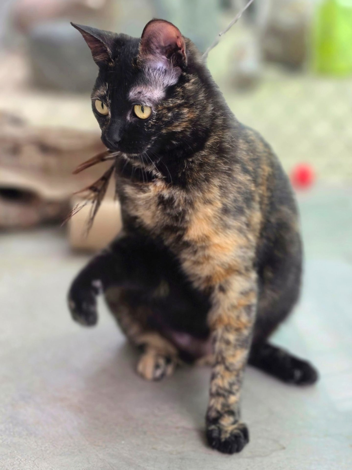 Diese süße schildpattfarbene Katze heißt Mercedes. Sie erhielt ihren Namen weil sie im Mercedes-Sprinter unseres Tierheims aufgefunden wurde. Damals war sie noch ein ganz winziges Kätzchen und sie war offenbar auch sehr schlau, denn wir vermuten, dass sie unseren Transporter benutzte, um ins Tierheim gebracht zu werden!